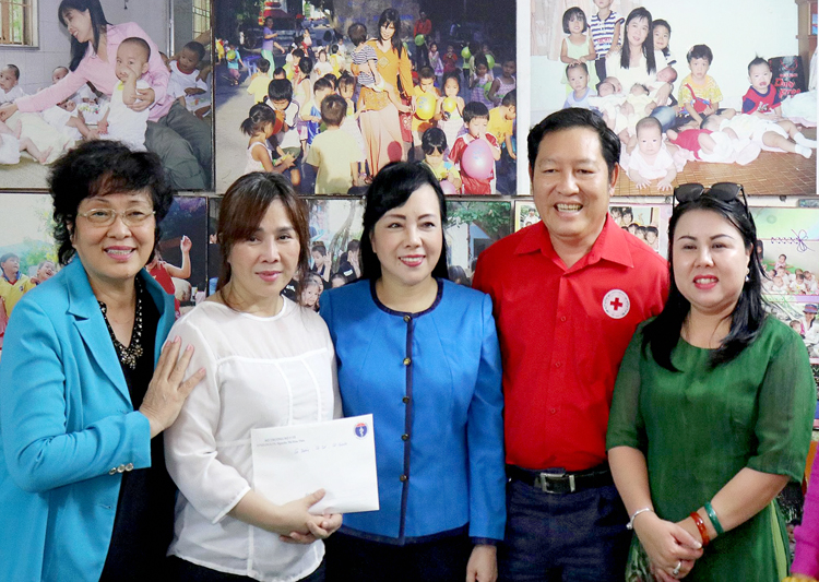 Bộ trưởng Bộ y tế Nguyễn Thị Kim Tiến (Áo xanh đứng giữa) trao tặng cho Trung tâm nhân đạo Quê Hương 70 triệu đồng và cho biết thời gian tới sẽ gửi tặng trung tâm một số thuốc men thiết yếu nhằm chăm sóc sức khỏe và hỗ trợ các cháu có điều kiện sống tốt hơn.